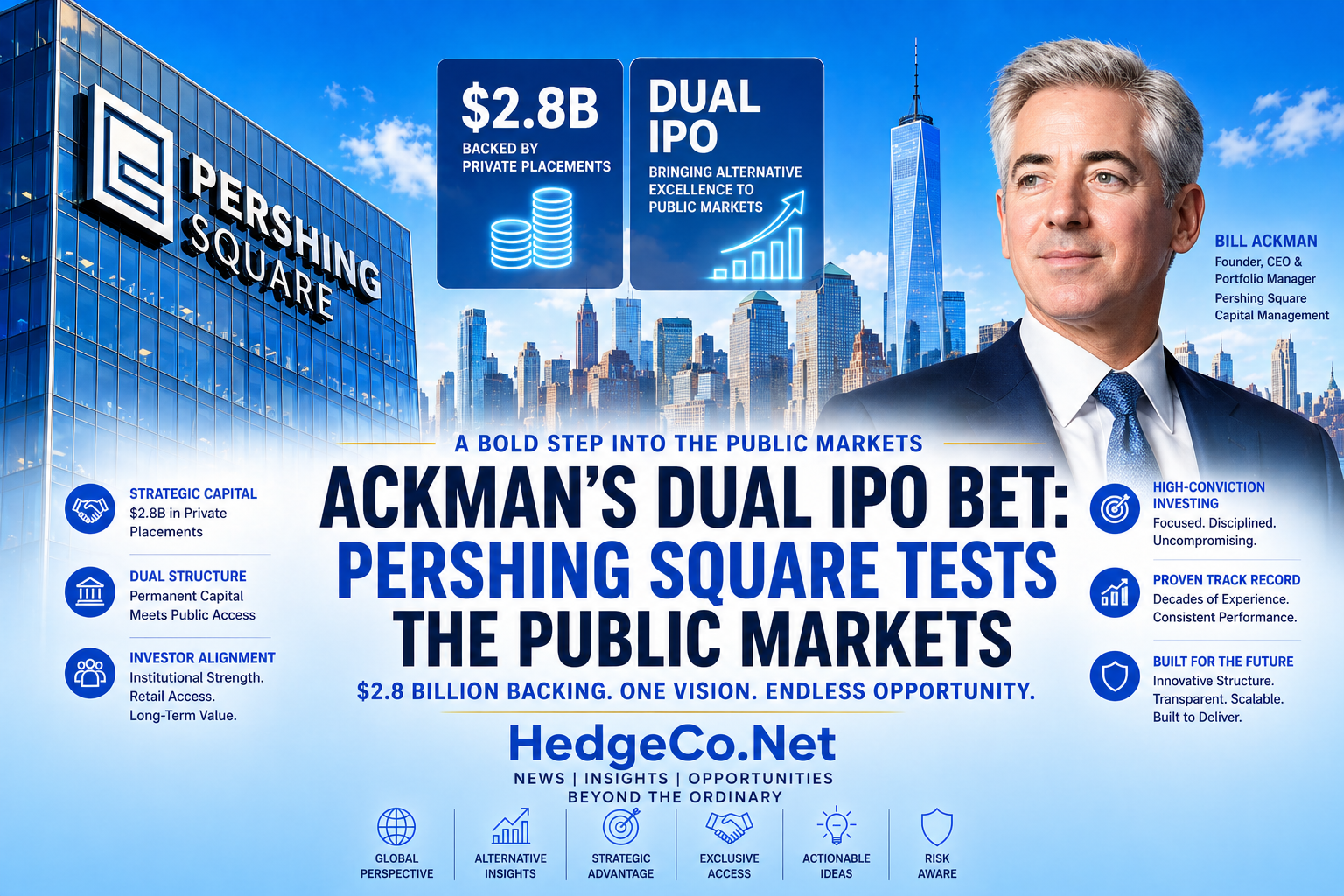(HedgeCo.Net) Bill Ackman is once again stepping into the spotlight—this time with a bold new attempt to bridge the gap between public markets and alternative investments. His firm, Pershing Square Capital Management, has initiated a roadshow for a dual initial public offering (IPO) structure backed by approximately $2.8 billion in private placements, signaling a potentially transformative moment not just for the firm, but for the broader hedge fund and alternative asset management industry.
