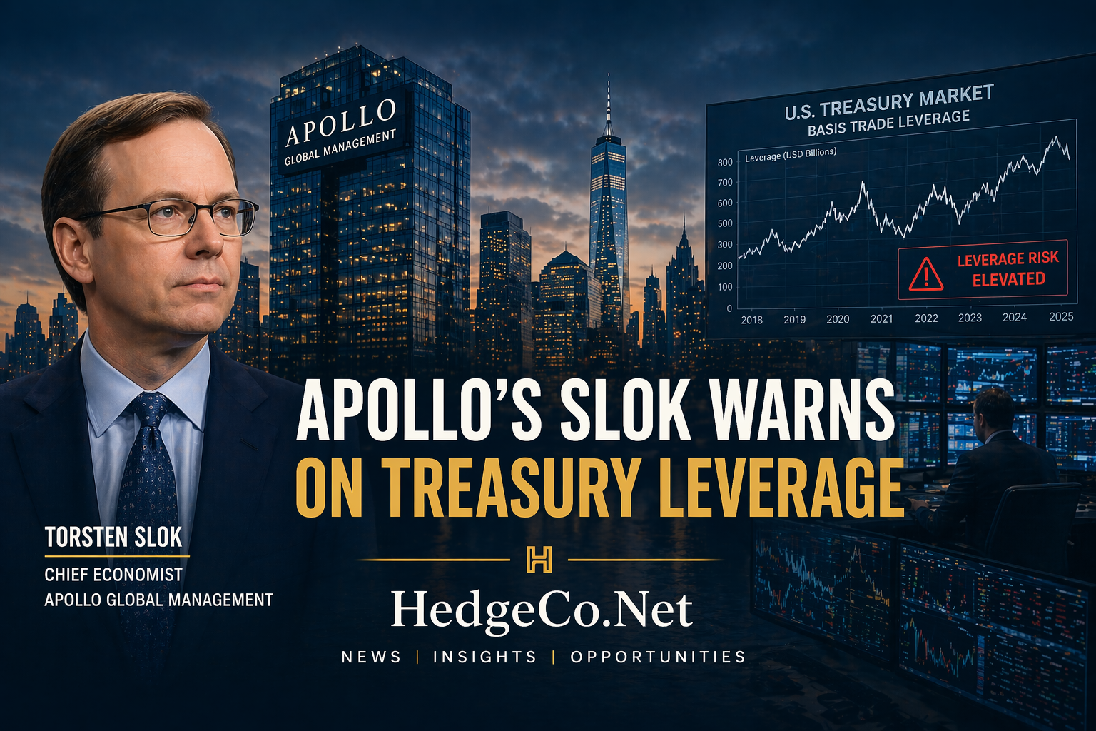 (HedgeCo.Net) A fresh warning from Torsten Slok, chief economist at Apollo Global Management, is sending ripples through institutional trading desks and risk committees across Wall Street. In a note circulated to clients today, Slok raised renewed concerns about the scale of hedge fund leverage embedded in the U.S. Treasury market—specifically pointing to the growing risks associated with the so-called “basis trade.”