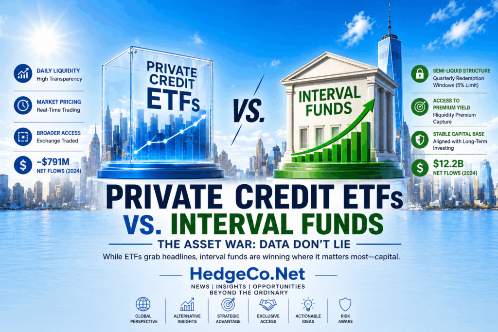 (HedgeCo.Net) While private credit ETFs have captured headlines as the latest innovation in bringing alternative investments to public markets, a quieter but far more consequential trend is unfolding beneath the surface. Interval funds—semi-liquid vehicles that blend elements of private markets with periodic liquidity—are rapidly outpacing ETFs in actual asset gathering. The numbers tell a decisive story: roughly $791 million in net inflows into private credit ETFs last year versus an overwhelming $12.2 billion flowing into interval funds.