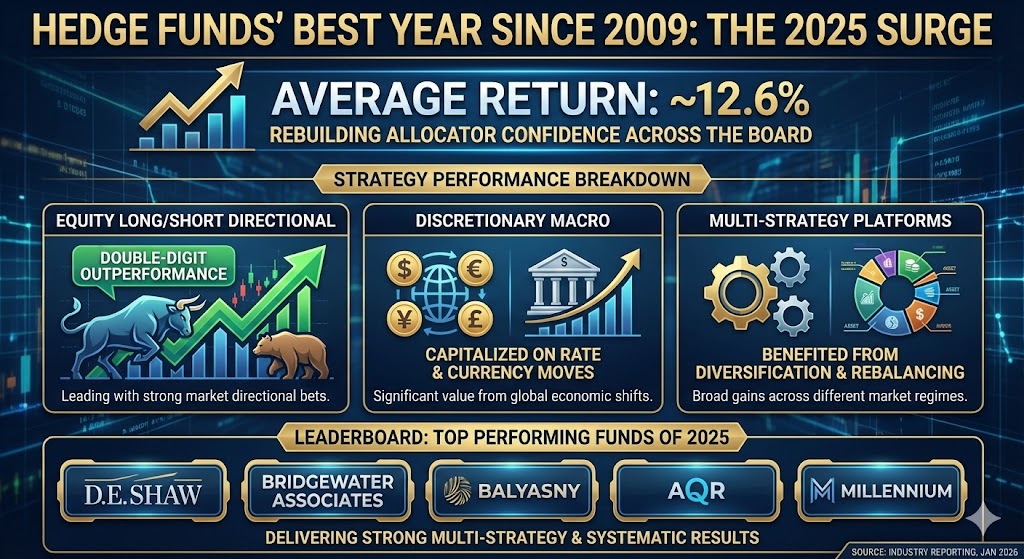 According to recent industry reporting, hedge funds delivered an average return of roughly 12.6 % in 2025, marking the best yearly result since 2009.