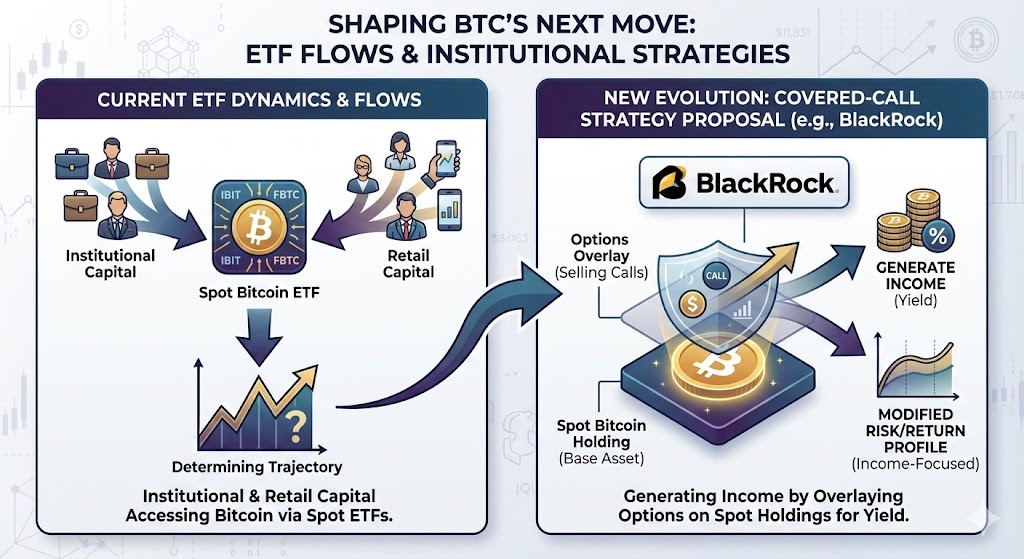 A key story today is how ETF dynamics could determine Bitcoin’s trajectory. A major asset manager (BlackRock) has filed a new Bitcoin ETF with a covered-call strategy proposal, aiming to generate income by overlaying options on top of a spot Bitcoin holding. This is a meaningful evolution in how institutional and retail capital might access Bitcoin with a risk/return profile that incorporates yield.
