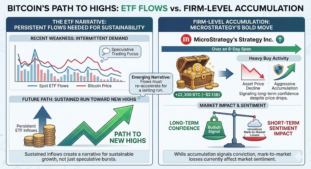 Recent analysis shows that Bitcoin’s path back to highs will depend heavily on whether spot ETF flows re-accelerateafter a period of intermittent demand. A narrative emerging in market commentary today argues that persistent ETF inflows — not just speculative trading — are needed to sustain a run toward new highs.