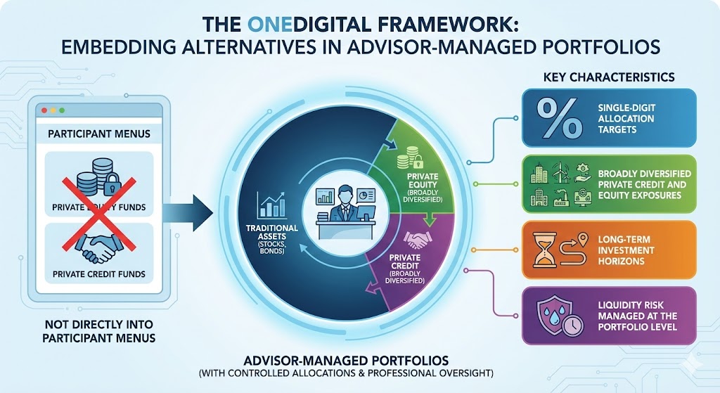 The OneDigital framework does not place private equity or private credit funds directly into participant menus. Instead, alternatives are embedded inside advisor-managed portfolios, with controlled allocations and professional oversight.
