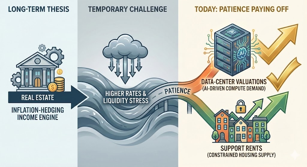 For allocators, the message is clear: private real estate is not dead—it is bifurcated. Core office assets remain challenged, but specialized real estate tied to technology, demographics, and infrastructure is emerging as a cornerstone allocation once again.