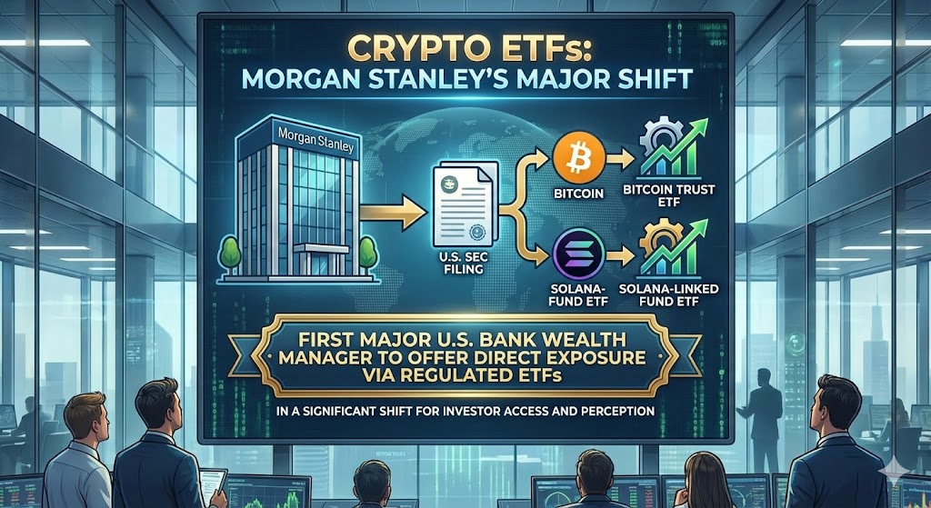 In a significant shift for investor access and perception, Morgan Stanley has filed with the U.S. Securities and Exchange Commission to launch two new crypto ETFs — including a Bitcoin trust and a Solana-linked fund. If approved, these would make Morgan Stanley the first major U.S. bank wealth manager to offer direct exposure via regulated ETFs.