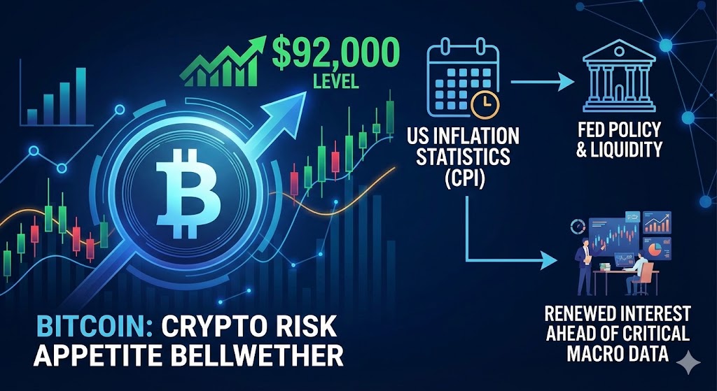 Bitcoin — the bellwether of crypto risk appetite — has rebounded toward the $92,000 level, signaling renewed interest among traders ahead of critical macro data releases, particularly U.S. inflation statistics that market participants view as potentially shaping Federal Reserve policy and liquidity conditions this year.