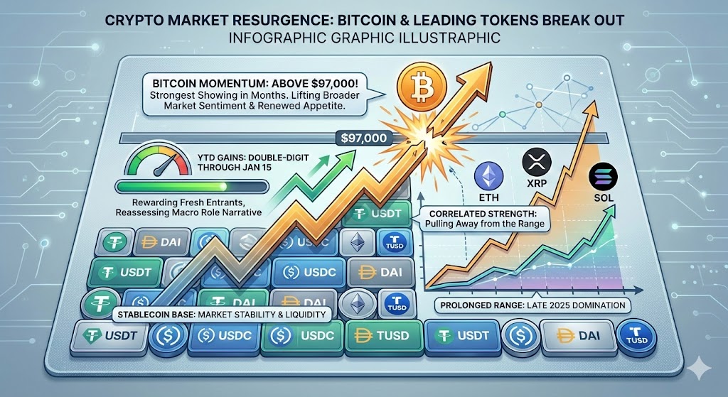 (HedgeCo.Net) After a turbulent late-2025, global crypto markets have staged a notable rebound this week — with Bitcoin pushing back above $97,000, broad altcoin strength, and renewed buying interest across major digital assets. This rally is striking given the uneven market backdrop and deep volatility that has characterized the first half of January.