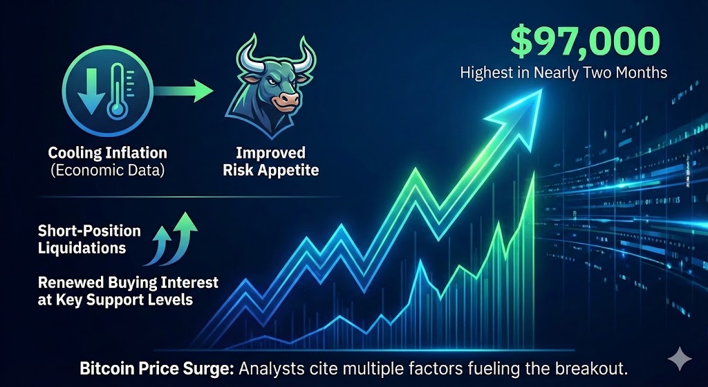 Bitcoin climbed sharply, breaching the $97,000 level in intraday trading, its highest in nearly two months — as risk appetite improved and investors reacted to economic data showing cooling inflation. Analysts noted the breakout was fueled in part by short-position liquidations and renewed buying interest at key support levels.