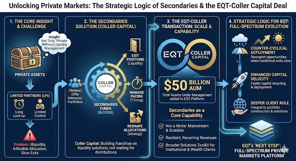 EQT’s acquisition of Coller Capital—at $3.2B upfront and up to ~$3.7B total value—is a landmark bet on the “secondaries supercycle” and a broader shift in alternative investments: from product manufacturing to portfolio solutions