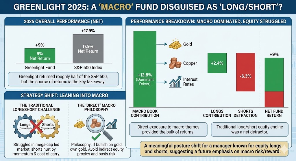 Perhaps the most revealing part of Greenlight’s latest messaging is how it characterizes its own performance drivers. In 2025, Greenlight’s fund returned 9%, roughly half of the S&P 500’s 17.9%—but the firm emphasized that the year’s returns came overwhelmingly from its macro book rather than its traditional long/short equity engine.
