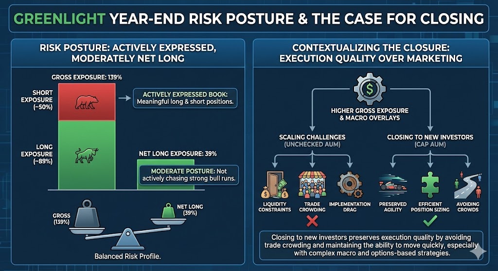 For allocators, exposure metrics like these help contextualize the closure. A fund that is structurally designed to run higher gross—especially if it is doing more macro overlays and options-based exposures—can face liquidity and implementation constraints that scale poorly past a certain AUM threshold. Closing to new investors can be less about marketing and more about execution quality: avoiding trade crowding, preserving the ability to move quickly, and keeping position sizing efficient.