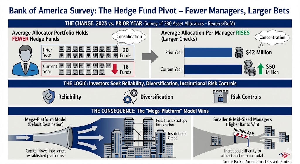 A Bank of America survey of 280 asset allocators (cited by Reuters) captures the change in one line: the average allocator portfolio now holds fewer hedge funds (18 vs. 20 the prior year), but writes larger checks into each manager (average allocation rising to $50 million from $42 million). The logic is straightforward—investors want reliability, diversification across pods/teams/strategies, and institutional-grade risk controls. The consequence is anything but simple: the “mega-platform” model is becoming the default destination for new hedge fund dollars, while smaller and mid-sized managers face a higher bar to win (and keep) capital.