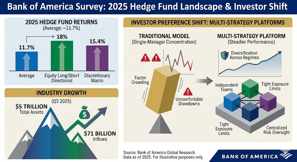 This consolidation is landing after a “better-than-feared” year for hedge funds broadly. Bank of America’s work pegs average hedge fund returns around 11.7% in 2025, with equity long/short directional strategies averaging 18% and discretionary macro around 15.4%. In the backdrop, industry assets reached about $5 trillion by Q3 2025, supported by performance and roughly $71 billion in inflows.