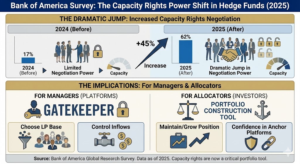 If you want a clear “tell” that big platforms have pricing power, look at capacity. According to the same Bank of America survey, 62% of hedge fund investors negotiated increased capacity rights in 2025, up from 17% in 2024. That’s a dramatic jump in a single year—and it signals that the most sought-after multi-managers can effectively choose their LP base and control inflows.