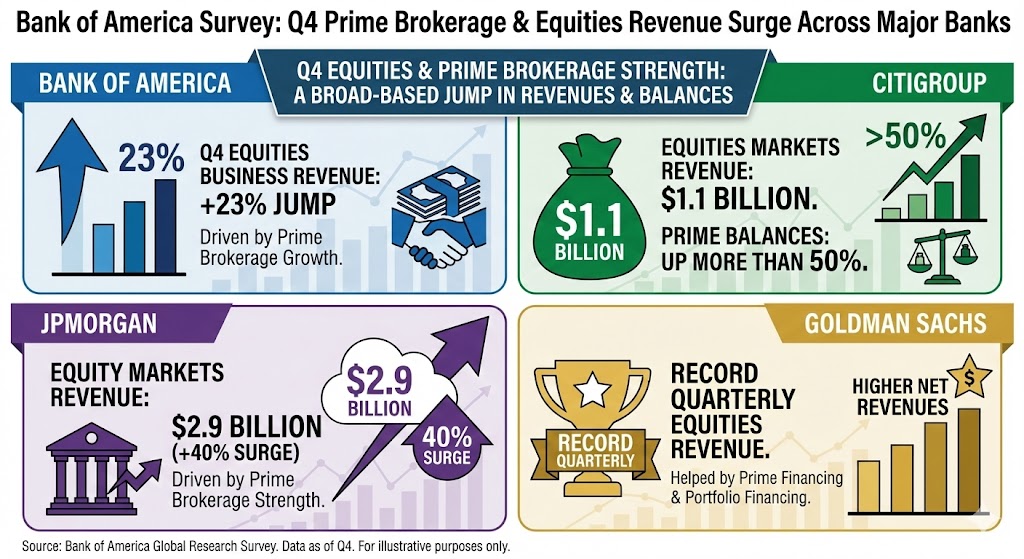 • JPMorgan reported a 40% surge in equity markets revenue to $2.9 billion, also driven by prime brokerage strength.
