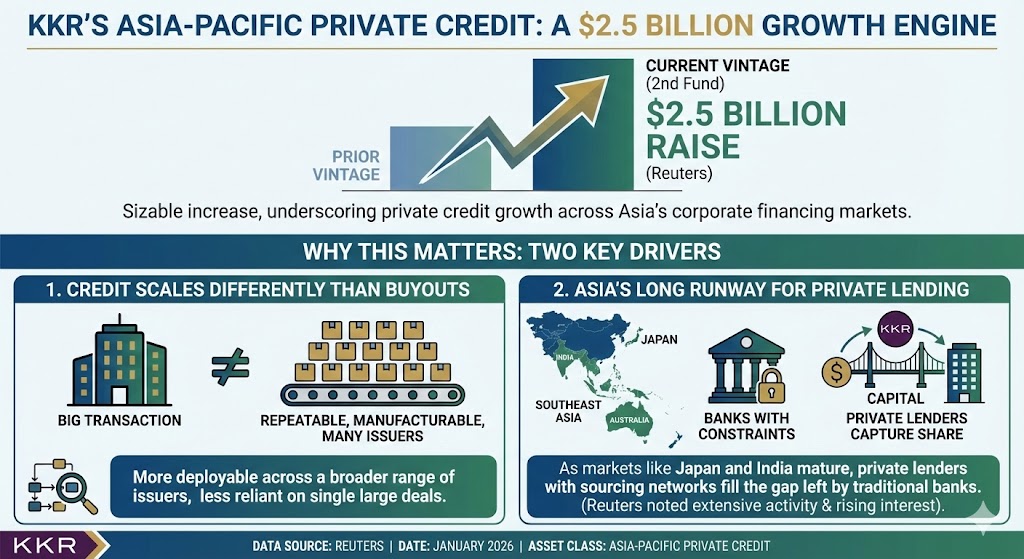 - Asia is a long runway. As banks manage constraints and markets mature (notably in Japan and India), private lenders with sourcing networks can capture share. Reuters noted KKR’s extensive investment activity in the region and rising investor interest.