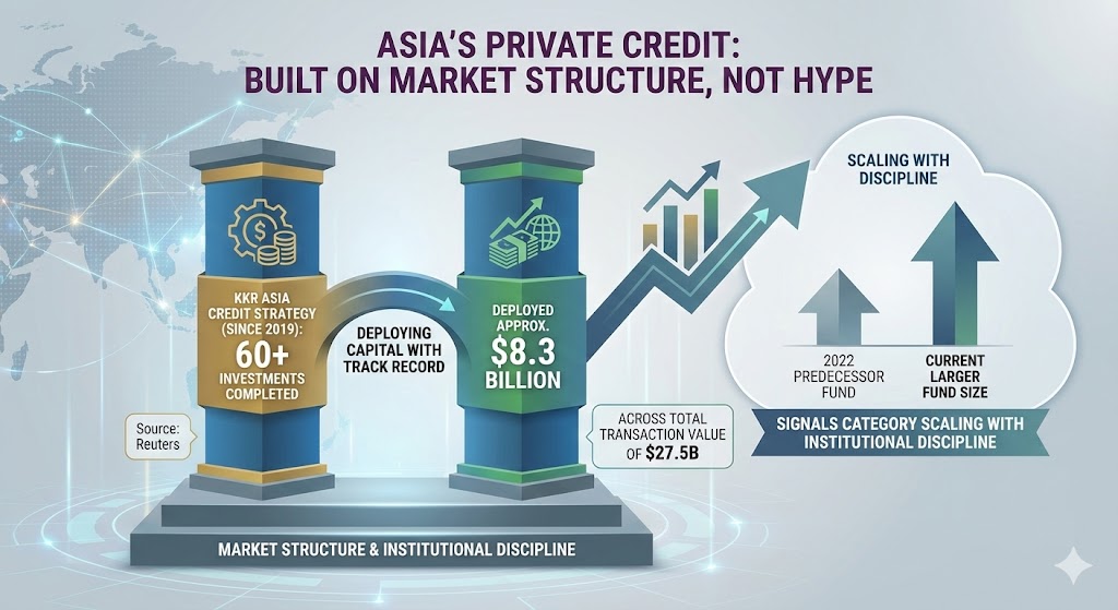 Reuters notes KKR has completed 60+ investments in the region through its Asia Credit strategy since 2019, deploying about $8.3B across total transaction value of $27.5B. That track record—combined with the larger fund size versus its 2022 predecessor—signals the category is scaling with institutional discipline.