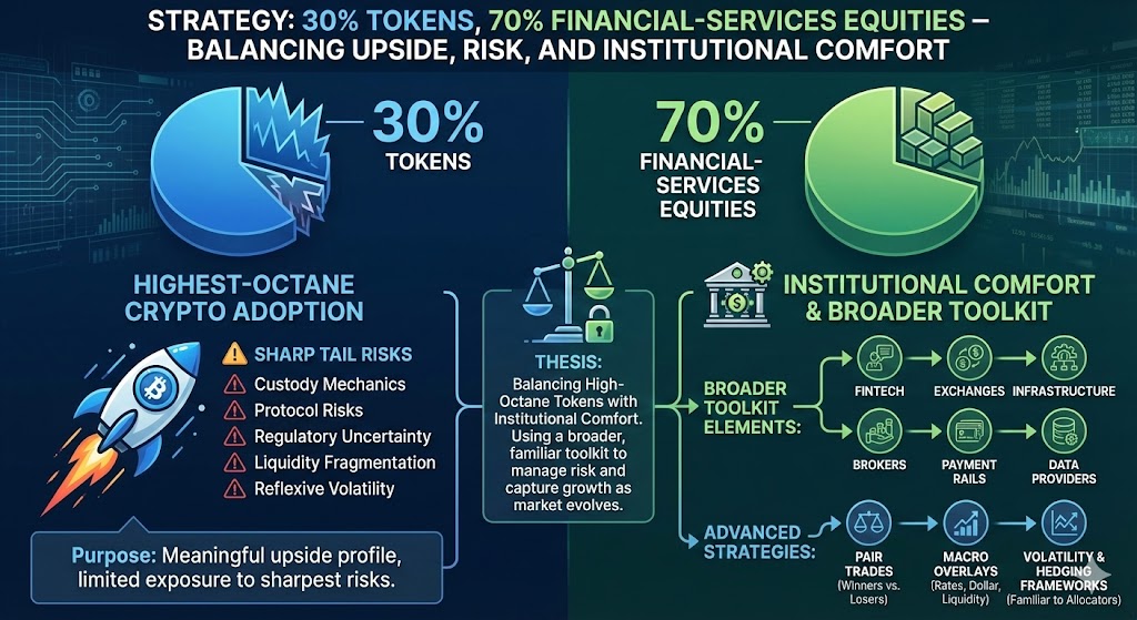 The strategy: 30% tokens, 70% financial-services equities—why that mix?