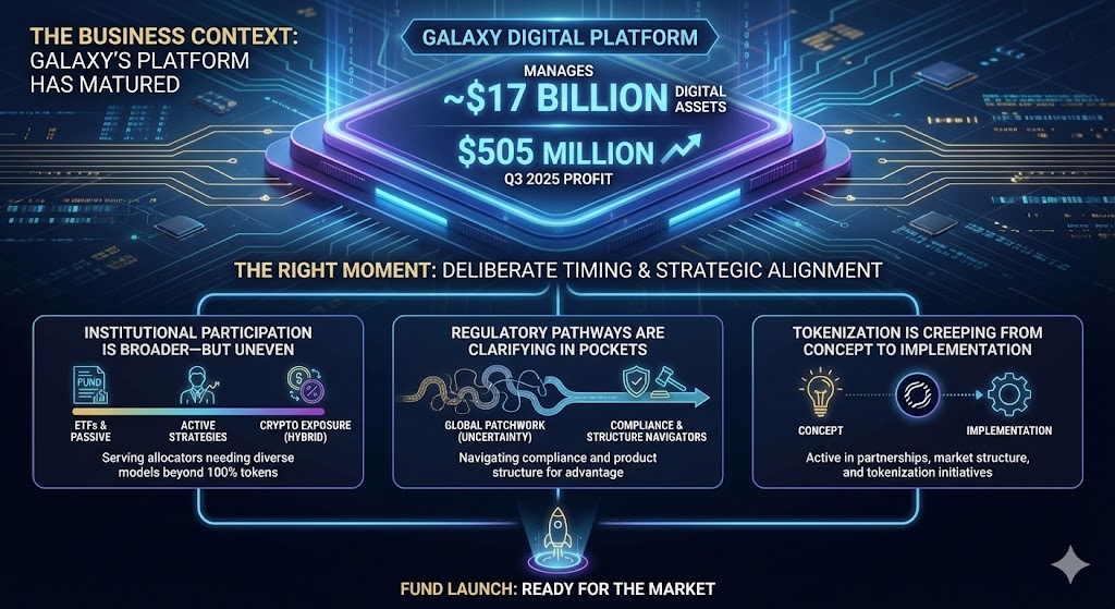 A hedge fund vehicle that mixes tokens and financial equities is, effectively, a way to monetize that platform maturity—turning Galaxy’s research, trading, and distribution into a product that fits the “institutional middle.”