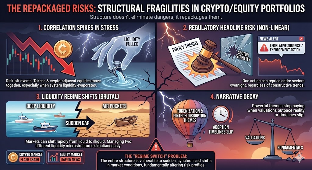 - Narrative decay. “Tokenization” and “fintech disruption” can be powerful themes, but themes can stop paying if valuations get ahead of fundamentals or if adoption timelines slip.