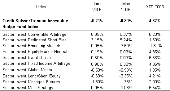The Credit Suisse/Tremont Investable Hedge Fund Index is down an estimated 0.21% net for the month of June 2006. The confirmed performance for May is down 0.80%.