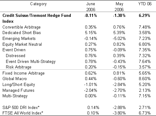 Performance for the Credit Suisse/Tremont Hedge Fund Index and its ten sub strategies is calculated monthly. June, May and year-to-date 2006 returns for all categories are listed below and at www.hedgeindex.com.