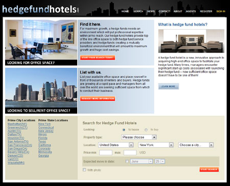 Find it here.For maximum growth, a hedge funds needs an environment which will put professional expertise within arms reach. Our hedge fund hotels provide top of the line office space to both hedge fund service providers and hedge funds creating a mutually beneficial environment that will amount to maximum growth and huge cost savings.List with us.List your available office space and place yourself in front of thousands of renters and buyers. Hedge funds are growing at a rapid pace and managers from all over the world are seeking sufficient space from which to conduct their business. |